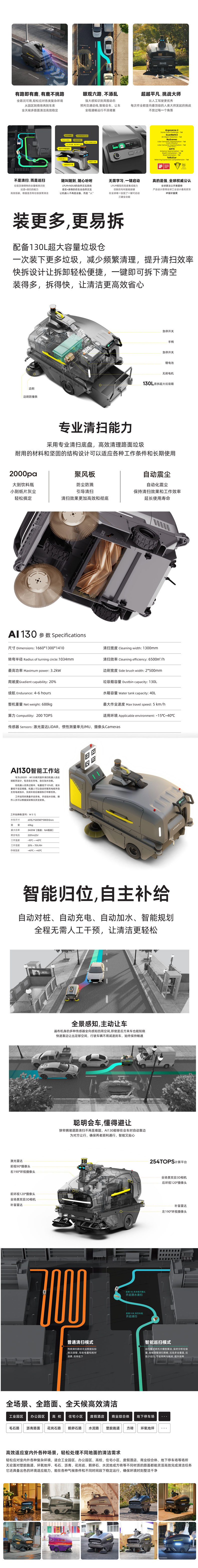 AI 130商用巡掃機器人-款搭載Master2000通用具身大腦的室外巡掃機器人,在大模型時代的一款內置了LPLM-10b大模型的機器人 全路況全天候無人值守作業,精準識別垃圾和障礙物擁有巡邏+掃地的能力,根據是否有垃圾按需清掃實現精準貼邊、錯車會車讓車控制力 為高品質服務而生,定義業主高端新體驗